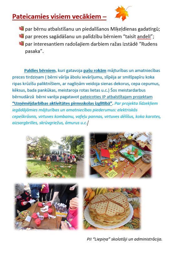 Aicinām visus vecākus ar savām idejām un brīvprātīgu iesaistīšanos biedrības darbībā atbalstīt pirmsskolas izglītības iestādi „Liepiņa”, lai veidotu vēl jaukāku vidi mūsu bērniem, nodrošinātu radošos procesus un atbalstītu bērnu izaugsmi!